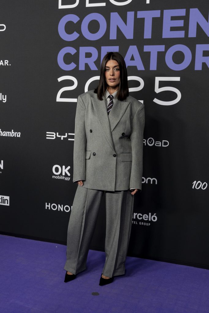 La influencer optó por un conjunto masculino compuesto por una chaqueta oversize en gris marengo, acompañada de corbata y pantalón wide leg, siguiendo la línea del power suiting que domina tanto las pasarelas como su propio armario y el de su esposa.