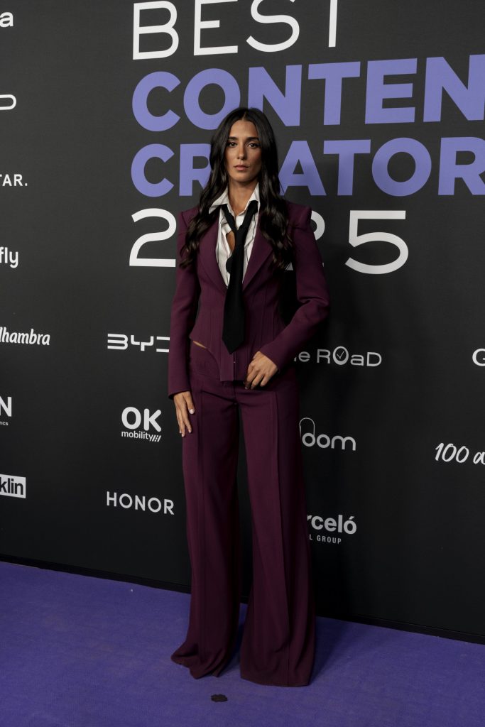Espectacular pudimos ver a Claudia Martínez con un traje en dos piezas color morado. La parte de arriba estaba formada por una chaqueta de corte asimétrico, camisa blanca con detalles en negro y una corbata anudada de modo desenfadado. La parte inferior, un pantalón de traje del mismo color de tiro bajo. Una reinterpretación del traje clásico que se la convirtió en una de las mejores vestidas de la noche.