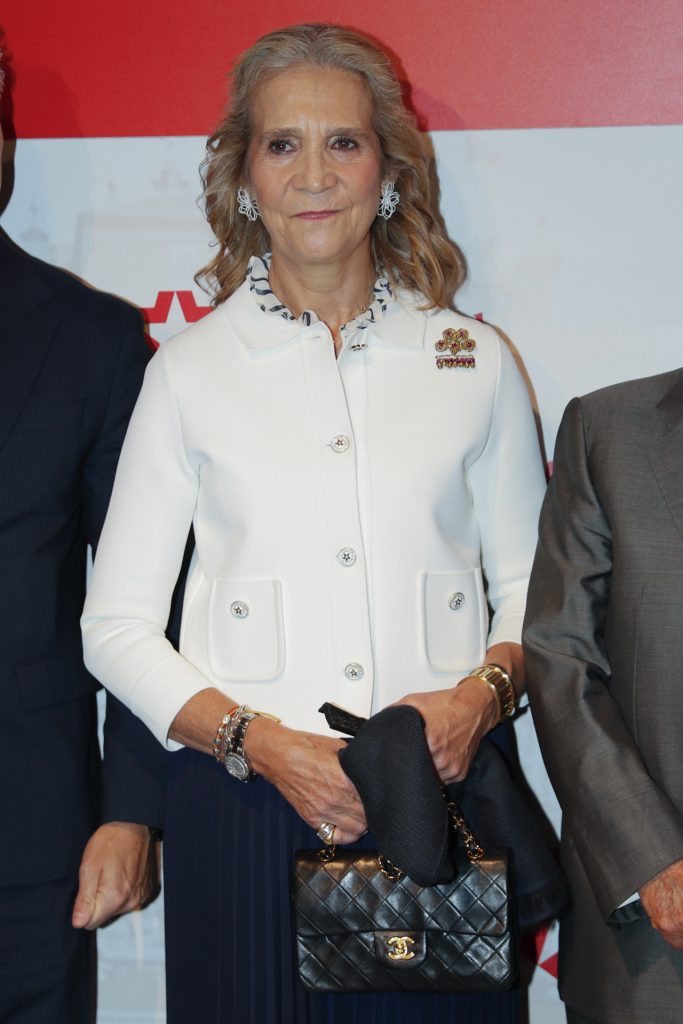 La infanta Elena llevó un bolso acolchado negro con cadena dorada, muy similar al icónico modelo de Chanel. El bolso, de formato mediano y estructura rígida, aportaba un toque de elegancia atemporal y encajaba perfectamente con el resto del conjunto.