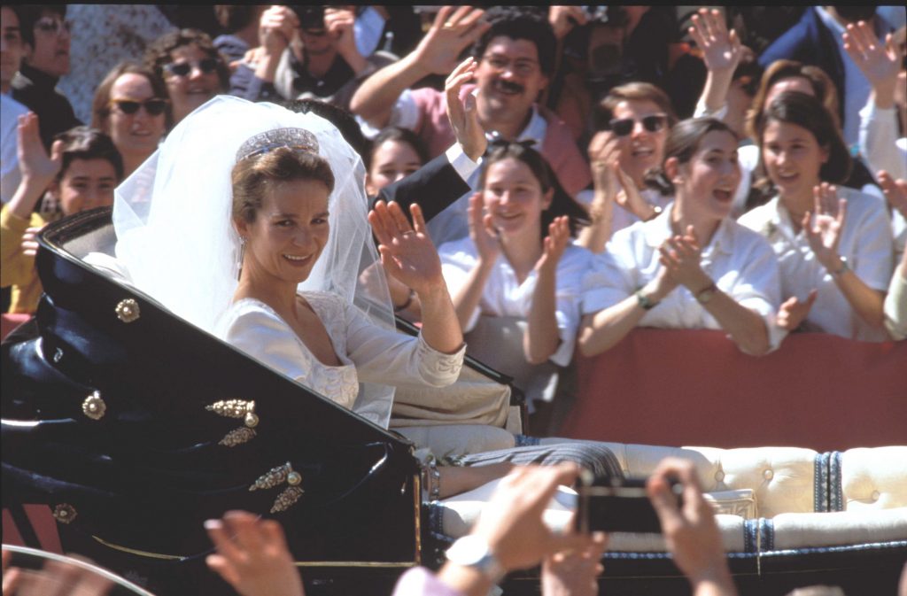 Una de las imágenes más esperadas de ese día fue la de la infanta Elena entrando en la catedral del brazo de su padre, el rey Juan Carlos. Para la ocasión, Elena lució un espectacular vestido de corte princesa, diseñado por el modista sevillano Petro Valverde.