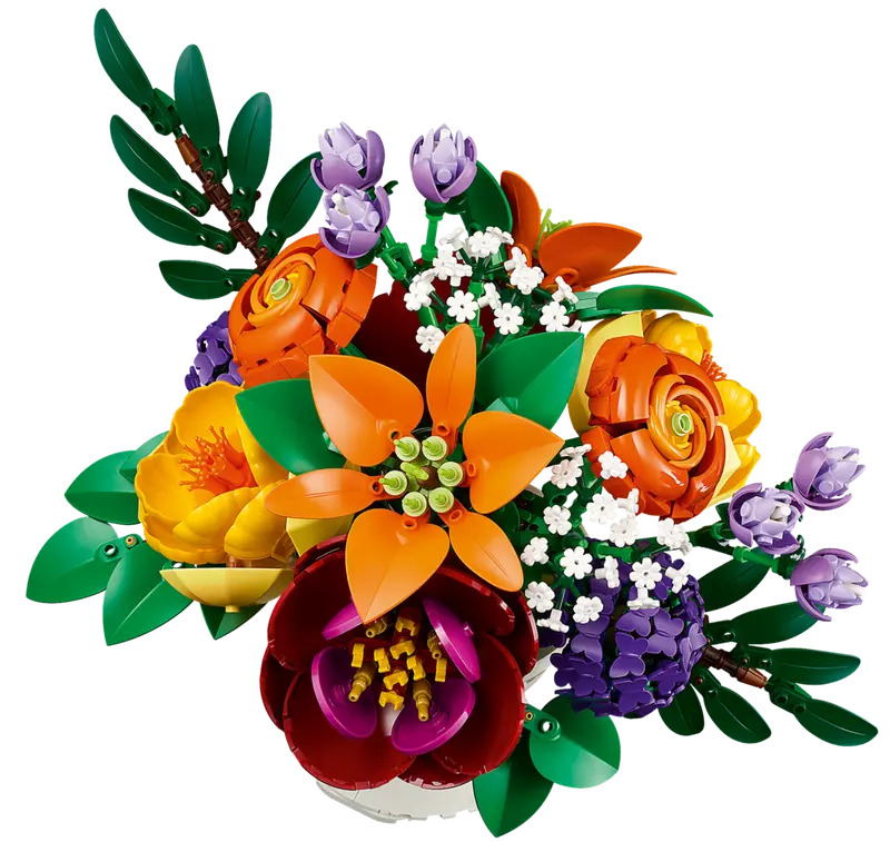 Para crear este patio tan especial, se han utilizado sets de la colección LEGO Botanicals, como el Ramo de Flores Silvestres, Arreglo Floral o Ramo de Flores Fantasía en Rosa. Entre las variedades representadas se encuentran rosas, violetas, lavandas y amapolas, ensambladas pétalo a pétalo con un nivel de detalle sorprendente.