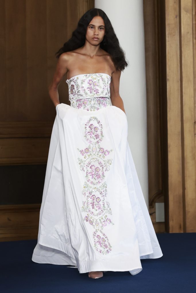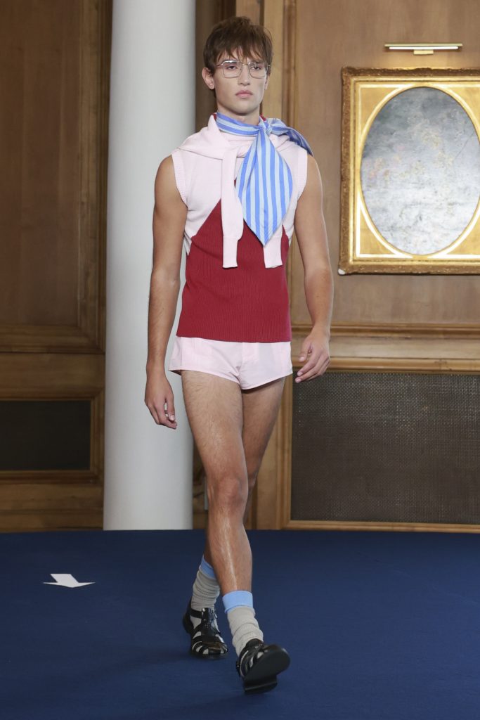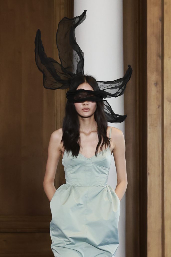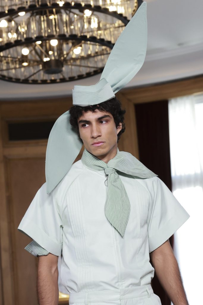 La colección, inspirada en el universo cinematográfico de Sofia Coppola, exploró la dualidad entre la inocencia y la rebeldía, con prendas que evocaban el coming-of-age desde una estética naíf y profundamente teatral. Sobre la pasarela desfilaron microvestidos con volantes troquelados, shorts verde menta, vestidos rosa pastel, fulares rígidos y sombreros artesanales firmados por Vivas Carrión, que aportaron un toque escenográfico a cada salida.