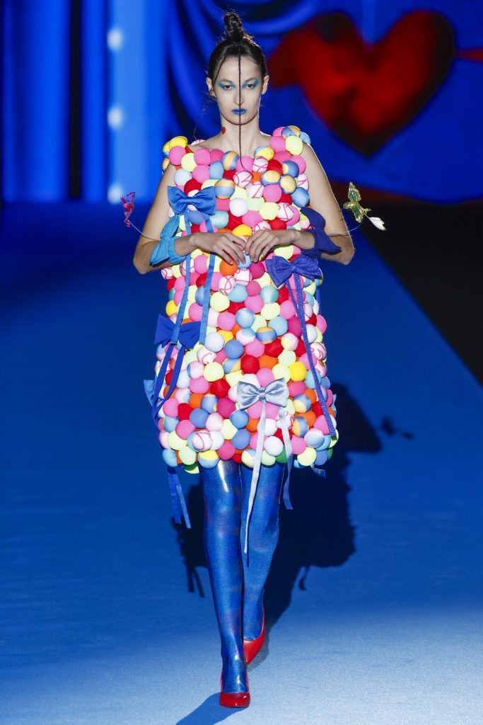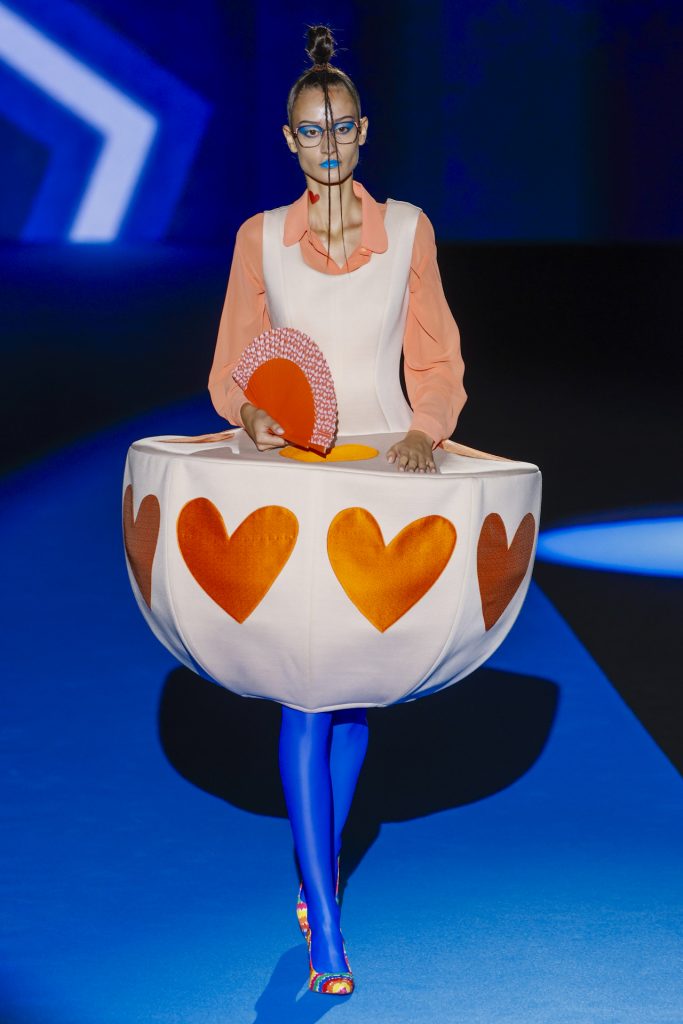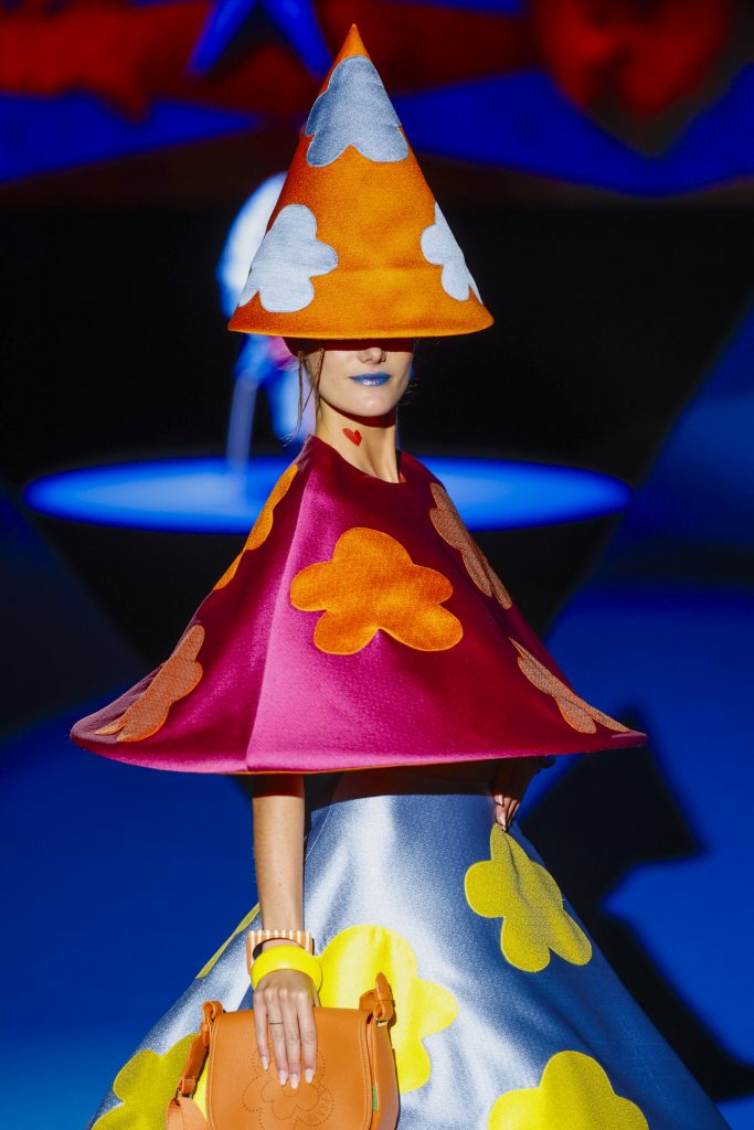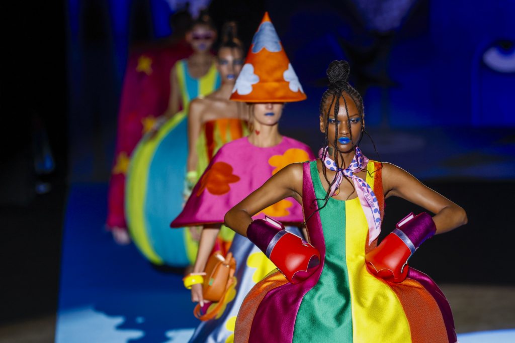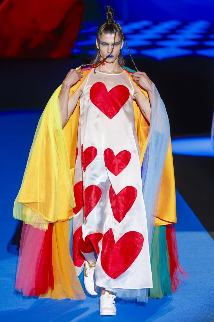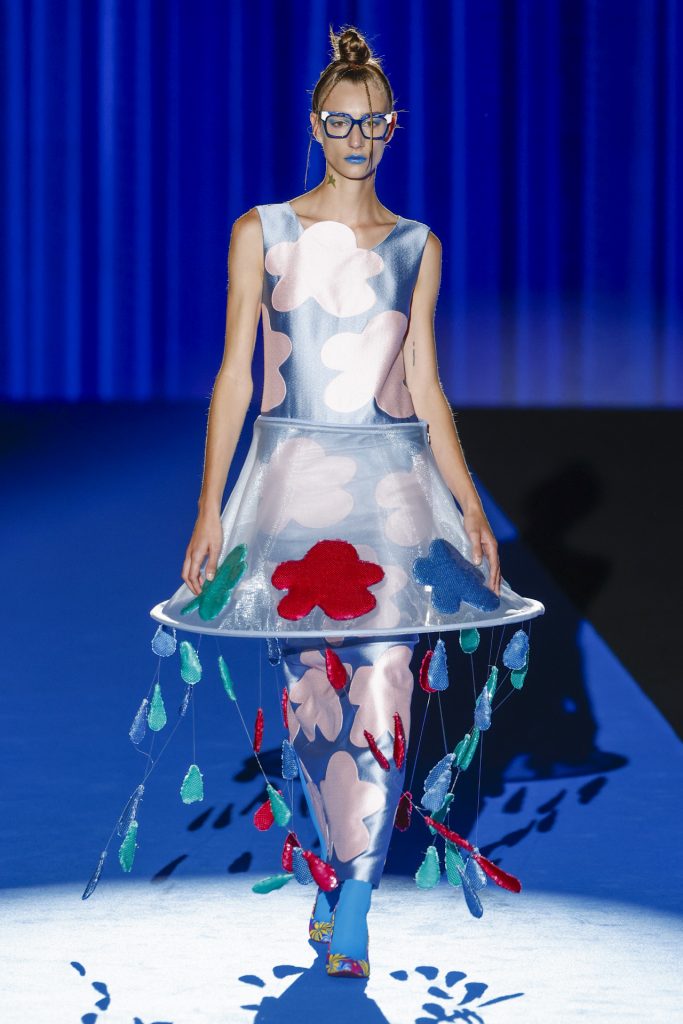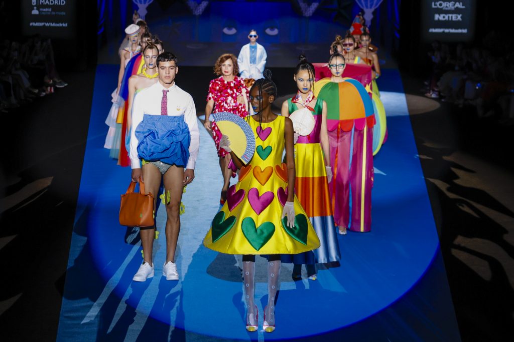 El desfile, celebrado en el pabellón 14.1 de IFEMA, arrancó con una secuencia de looks geométricos y saturados, donde los clásicos corazones, nubes, estrellas y flores se transformaban en patrones dinámicos, casi cinéticos, creados a partir de procesos generativos. La IA no sólo participó en el diseño gráfico de los estampados, sino también en la composición de siluetas, paletas cromáticas y secuencias escénicas, dando lugar a una colección que parecía dialogar entre el archivo emocional de Ágatha y una nueva lógica visual.