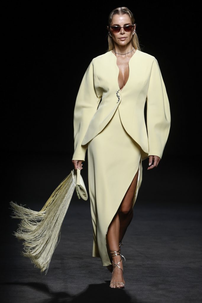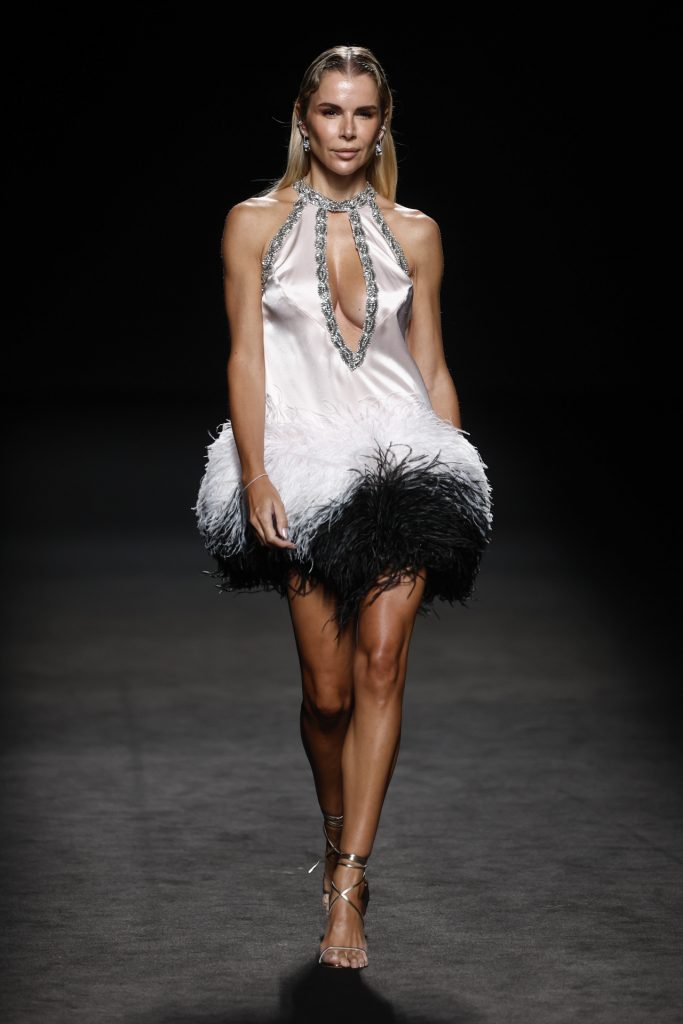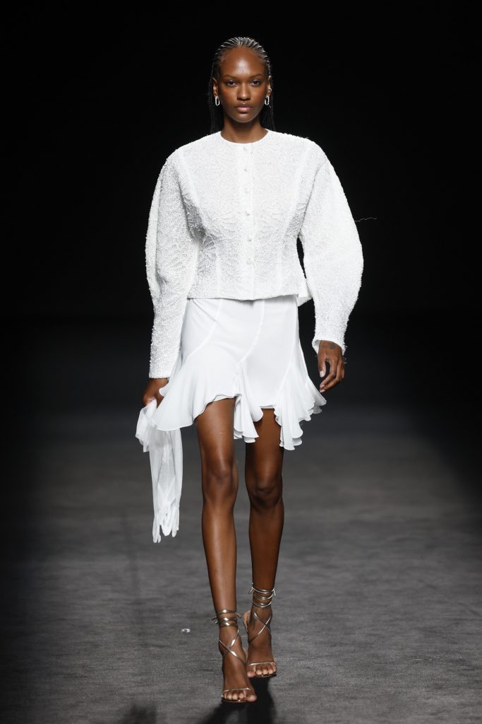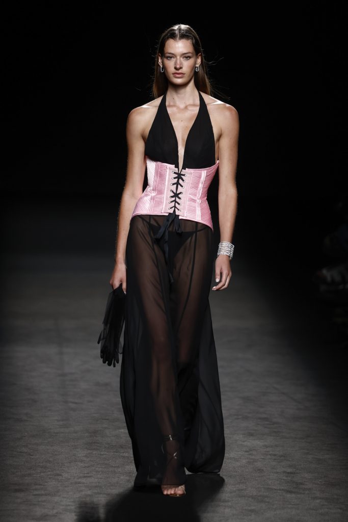 La modelo Águeda López, esposa del cantante Luis Fonsi, fue la encargada de abrir y cerrar el desfile, consolidando su papel como rostro internacional de la firma. Inició la pasarela con un minivestido rosa empolvado de escote corazón y mangas abullonadas, acompañado por un velo largo de tul que aportaba dramatismo y teatralidad. Para el cierre, desfiló con un vestido blanco con detalle de malla y un kimono oversize, en una aparición que captó todas las miradas y reforzó el carácter escénico de la colección.