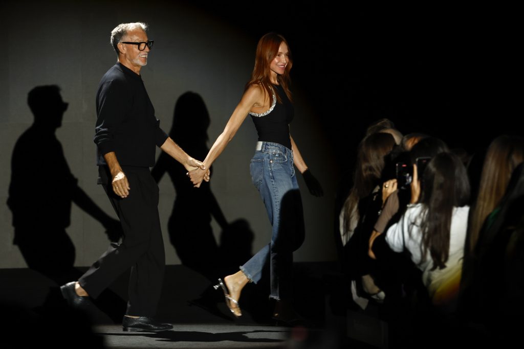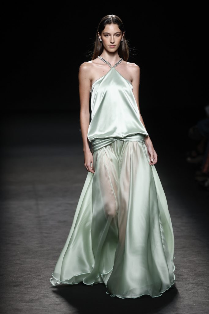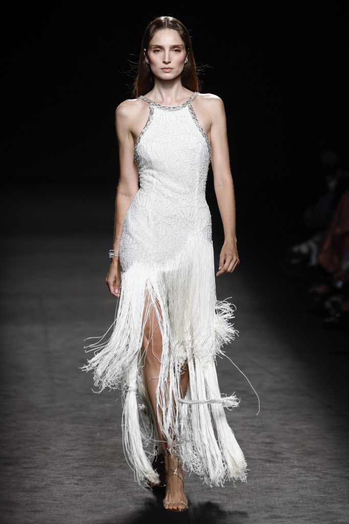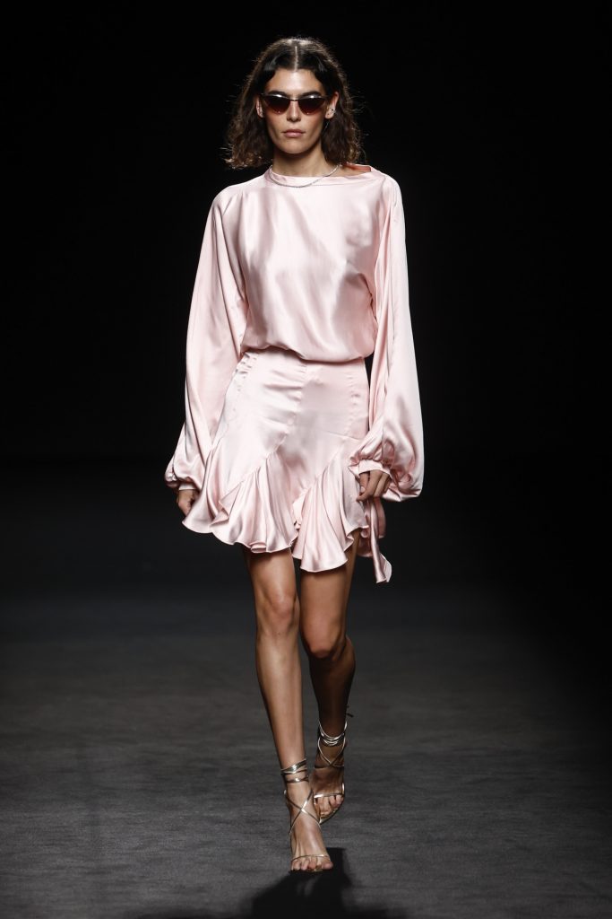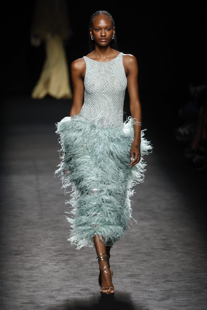 La modelo Águeda López, esposa del cantante Luis Fonsi, fue la encargada de abrir y cerrar el desfile, consolidando su papel como rostro internacional de la firma. Inició la pasarela con un minivestido rosa empolvado de escote corazón y mangas abullonadas, acompañado por un velo largo de tul que aportaba dramatismo y teatralidad. Para el cierre, desfiló con un vestido blanco con detalle de malla y un kimono oversize, en una aparición que captó todas las miradas y reforzó el carácter escénico de la colección.