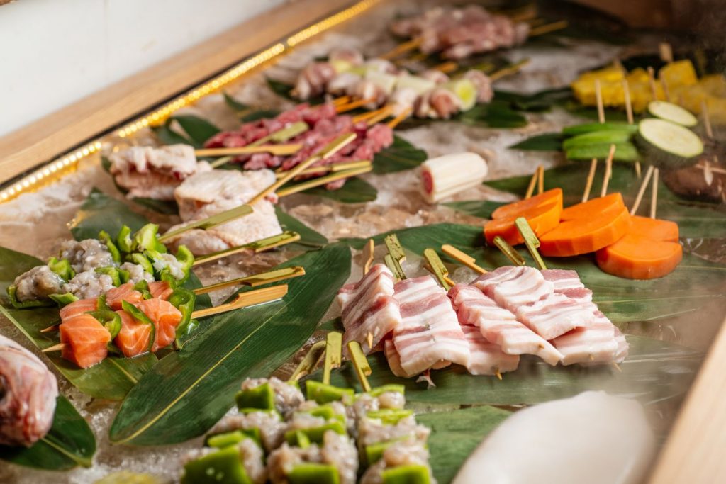 El corazón de la experiencia está en el yakitori (焼き鳥), literalmente “pájaro a la parrilla”. Es el plato de las tabernas japonesas, el símbolo de los izakaya, donde las conversaciones se alargan entre el aroma del carbón y los destellos del fuego. En Toritama Yakitori, el yakitori se prepara al modo más puro: pequeños cortes de pollo y otras carnes asadas lentamente, sin prisas, hasta alcanzar una textura tierna y un sabor que se clava en la memoria.