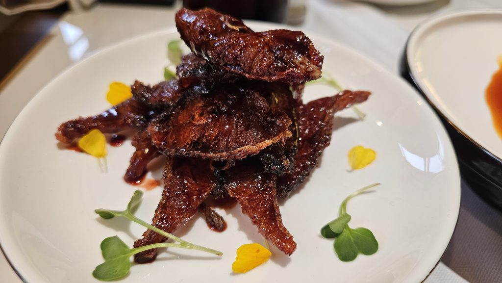 Pero hay un protagonista indiscutible en Zhen: el Pato Pekín. Aquí se asa de forma tradicional, en horno propio y con leña de frutas, lo que aporta una fragancia suave y un ahumado leve que acompaña sin imponerse. El ritual del corte en mesa y la forma en que se disfruta, acompañado de sus crêpes finísimas, salsa y cebolleta, convierte el momento en una celebración.