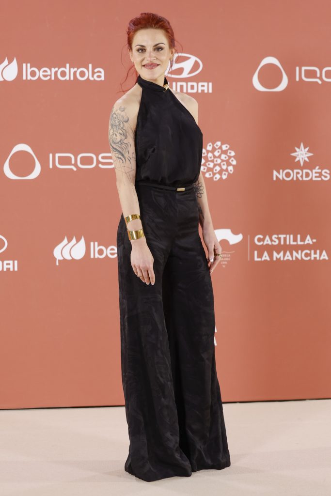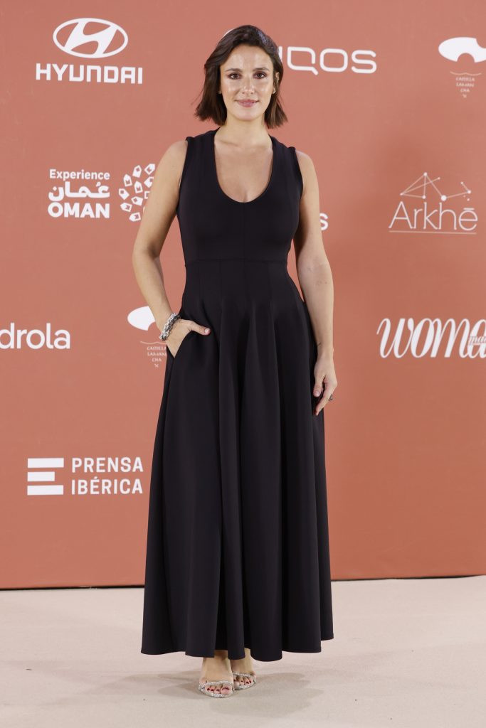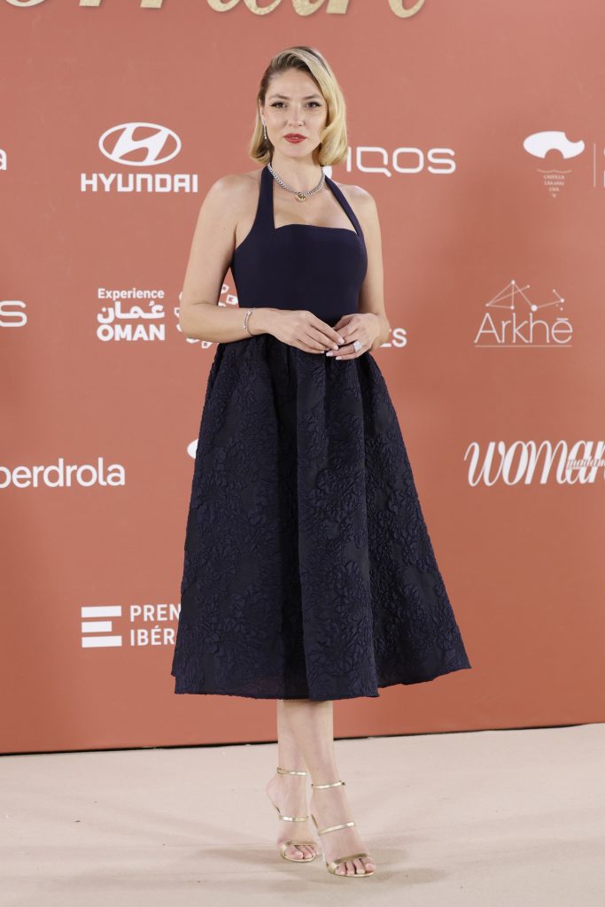 La alfombra blanca del evento fue testigo de una auténtica pasarela de elegancia. Nieves Álvarez, presentadora de la gala y una de las homenajeadas por su trayectoria, deslumbró con un vestido de Elisabetta Franchi en dos texturas: cuerpo palabra de honor en dorado brillante y falda negra corte sirena con un voluminoso volante a la cadera. Lo acompañó con salones negros de Aquazzura y un recogido pulido que realzaba sus pendientes geométricos.