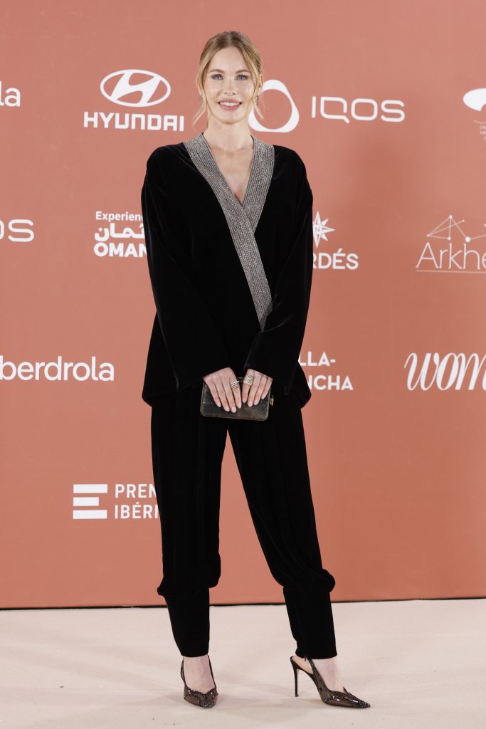 La modelo sueca Helen Svedin, también premiada por su trayectoria, apostó por un conjunto de terciopelo negro de inspiración asiática, compuesto por pantalón bombacho con tobillos cerrados y chaqueta cruzada tipo kimono con ribete plateado. Un look sobrio y sofisticado que reafirma su elegancia atemporal.