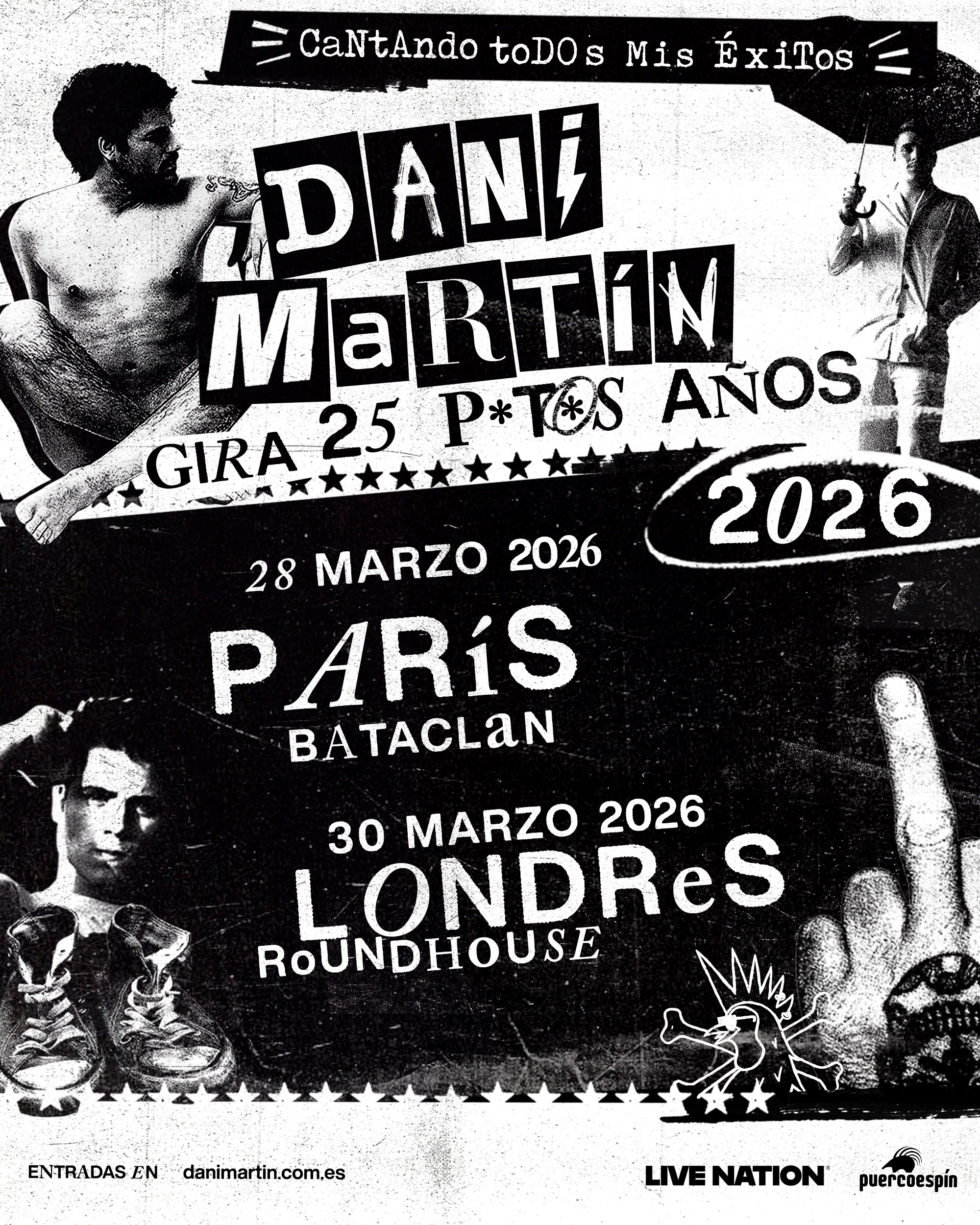 Dani Martín anuncia dos conciertos internacionales en marzo dentro de su gira ’25 p*t*s años’: París y Londres se suman al calendario, con entradas a la venta el jueves 27 de noviembre a las 11h a través de los canales oficiales.