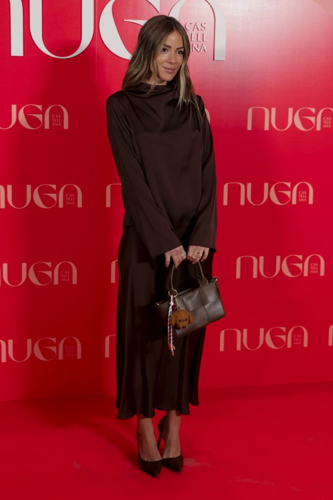 Combinó el vestido con zapatos de tacón a tono y un bolso de mano marrón con detalles metálicos de Corsica, creando una armonía cromática muy cuidada. El cabello suelto y ligeramente ondulado, junto a un maquillaje natural con énfasis en los ojos, completaban un look que fusionaba minimalismo y presencia escénica, ideal para una noche de estreno en plena Castellana.