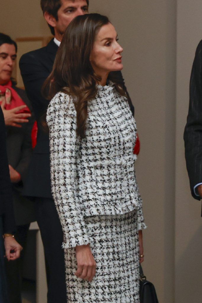 Para la ocasión, Doña Letizia estrenó un dos piezas confeccionado en tweed blanco y negro con estampado de pata de gallo, compuesto por una chaqueta entallada de cuello redondo y manga larga y una falda lápiz a la altura de la rodilla. El diseño evocaba directamente los icónicos trajes de la casa Chanel, proyectando una imagen solemne, elegante y sin excesos ornamentales, perfecta para un acto institucional de alto nivel.