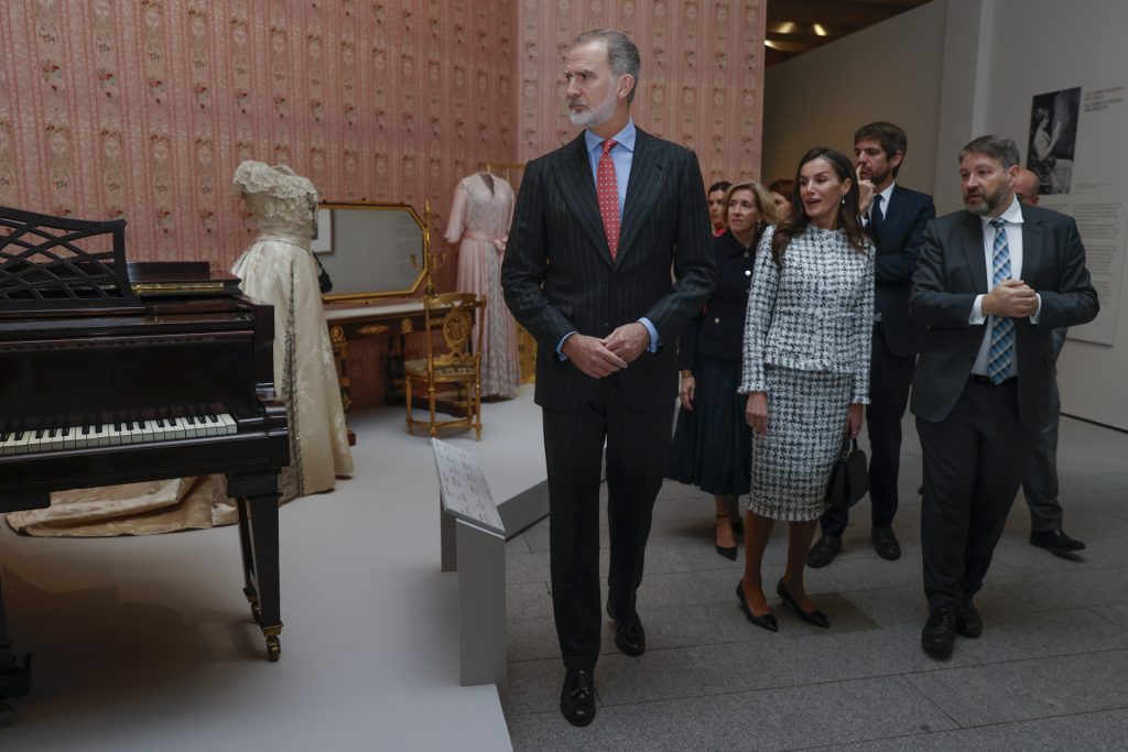 El Rey Felipe VI y la Reina Letizia recorrieron las distintas secciones acompañados por el ministro de Cultura, Ernest Urtasun, el delegado del Gobierno en Madrid, Francisco Martín Aguirre, y el director de la Galería, Víctor Cageao. Durante la visita, mostraron especial interés por los retratos y objetos personales de la reina, así como por las cartas y documentos que ilustran su papel institucional y familiar.