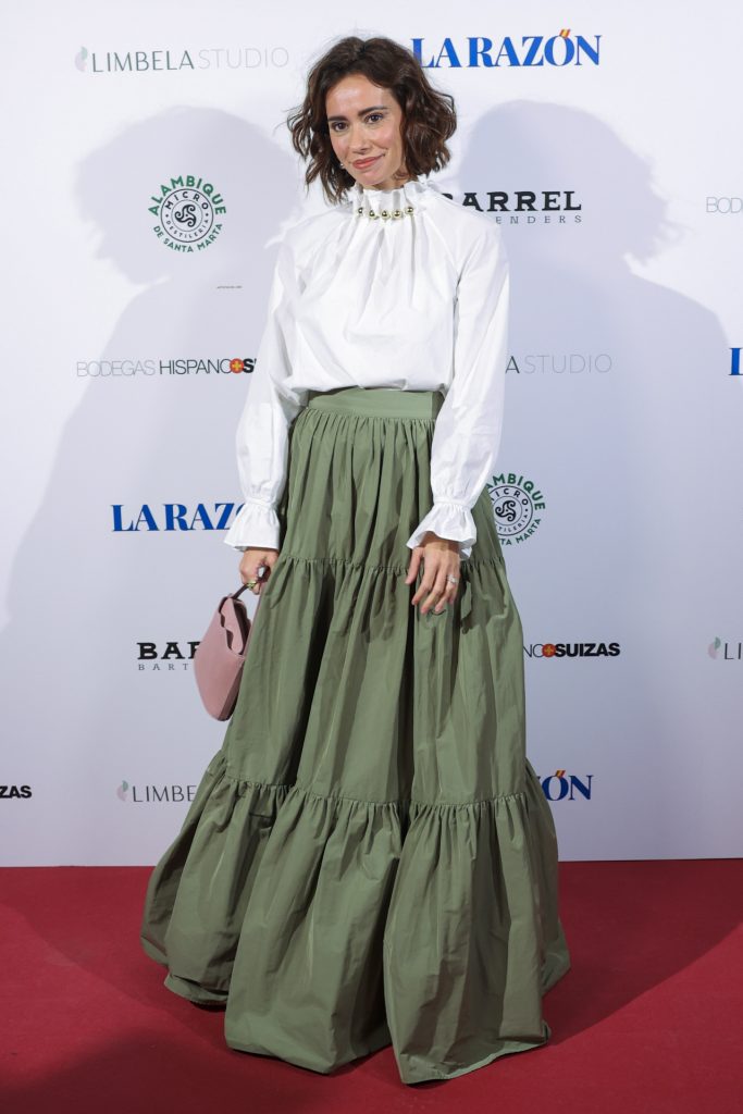 Sheila Conde se decantó por un estilismo de inspiración romántica y teatral, con un marcado protagonismo de las texturas y el contraste cromático. Lució una blusa blanca de cuello alto con bordados dorados, mangas largas con puños fruncidos y volumen en los hombros, que aportaban dramatismo y sofisticación. La combinó con una falda verde oliva de gran volumen, confeccionada en capas y con estructura tipo tulipán, que añadía movimiento y presencia al conjunto. El contraste entre el blanco luminoso y el verde profundo funcionaba como declaración de estilo, reforzado por un bolso rosa empolvado que aportaba un toque inesperado y femenino. Sheila Conde demostró que el volumen, bien equilibrado, puede ser sinónimo de elegancia y personalidad.
