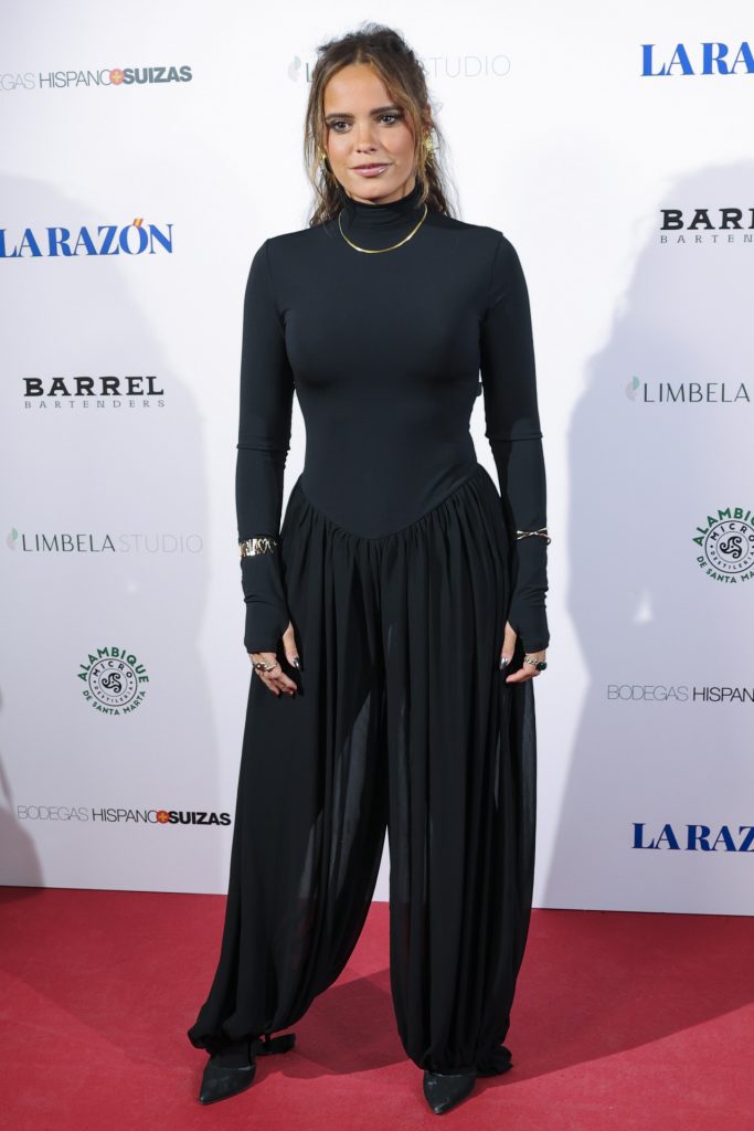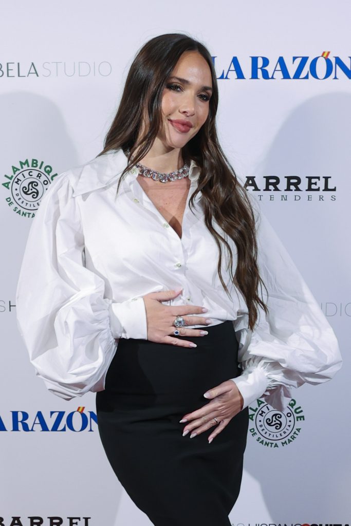 La modelo y comunicadora Ana Moya apostó por uno de los looks más teatrales y sofisticados de la noche, con una camisa blanca de mangas abullonadas firmada por Mario Salafranca, una pieza icónica que aporta dramatismo y estructura al conjunto. La combinó con una falda negra entallada, que le permitía lucir la tripita de su segundo hijo, que espera junto a Diego Conde. El estilismo se completó con zapatos de punta, que suman elegancia sin competir con el protagonismo de la camisa, y joyería llamativa, entre ellas un collar joya y varios anillos, que aportan brillo y carácter. El resultado fue un conjunto sofisticado, navideño y muy editorial, perfecto para una noche en la que la moda se puso al servicio del talento cultural.