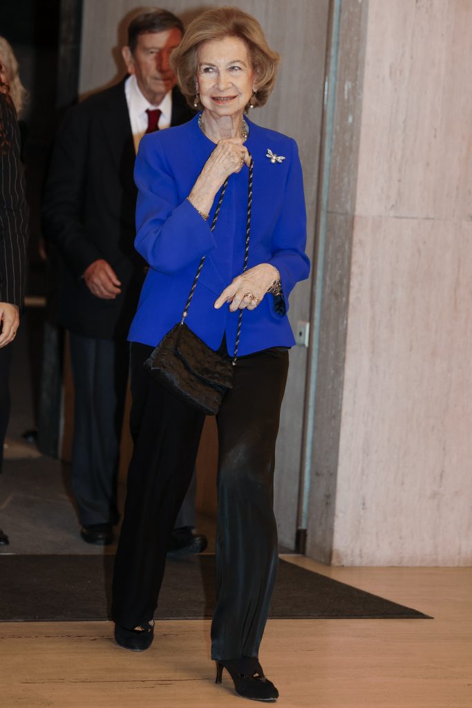 A sus 87 años, doña Sofía se mostró serena y sonriente, fiel a su estilo institucional, y volvió a ejercer de firme defensora de la ciencia y el patrimonio cultural. Para la ocasión, eligió un conjunto sobrio y elegante, con chaqueta azul klein sin botones, pantalón negro recto y uno de sus característicos broches de motivos naturales, aportando un toque colorista a un estilismo impecable.