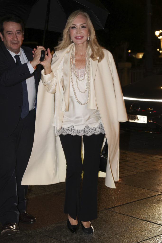 Entre los asistentes se pudo ver a Carmen Lomana, que llegó con un elegante abrigo de paño en tono blanco hueso, combinado con un top lencero y pantalones negros clásicos, rematados con un collar de perlas y pendientes de lágrima.