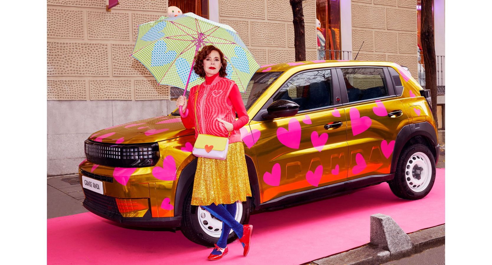 La creadora ha aplicado su inconfundible sello creativo sobre la carrocería del modelo, imprimiendo un llamativo patrón de corazones rosas sobre un fondo dorado que convierte al vehículo en una joya contemporánea. Este ejercicio de estilo no solo aporta impacto visual, sino que encapsula la nueva filosofía de FIAT: una movilidad emocional, optimista y accesible que celebra el diseño sin complejos, bajo el concepto de la ‘Nueva Dolce Vita‘.