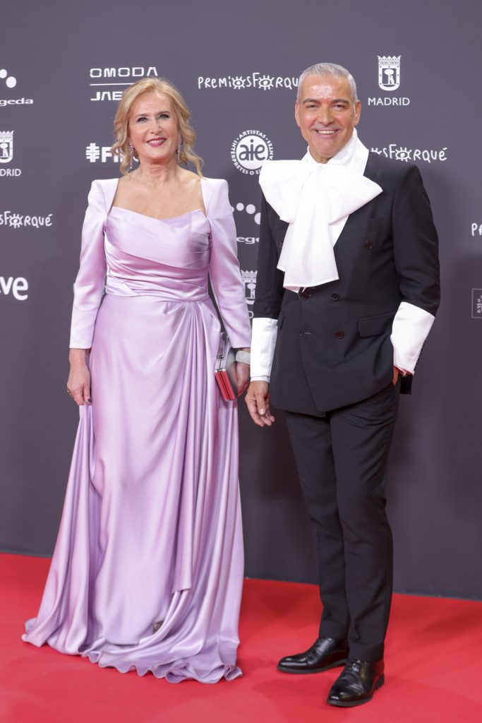 Juan Carlos Verino apostó por la sobriedad clásica con un traje negro de corte impecable, de inspiración sartorial, que transmitía autoridad y estilo. El conjunto se completaba con una camisa blanca de puños marcados y un cravat-style en tono blanco, que aportaba un aire teatral y distinguido. El detalle del doble abotonado en la chaqueta reforzaba la estructura del look, mientras que el contraste entre el negro profundo y el blanco luminoso otorgaba fuerza visual. Su presencia en la alfombra roja fue un ejemplo de cómo reinterpretar la elegancia masculina con un toque escénico y contemporáneo.