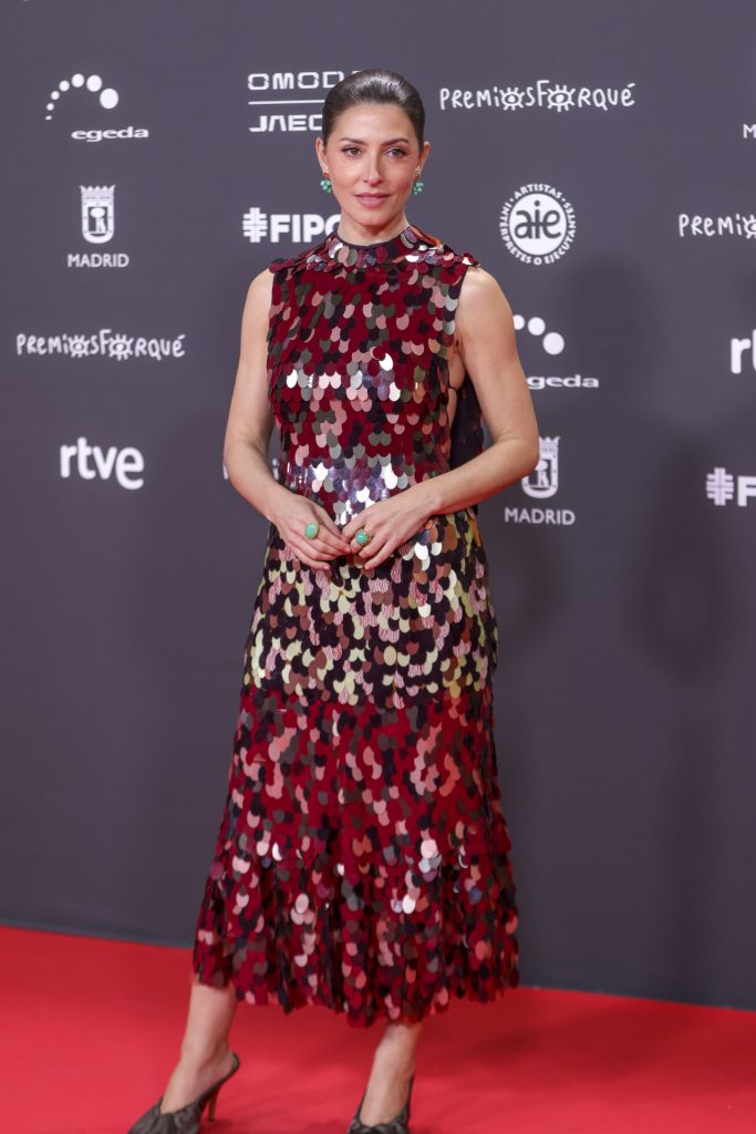 Bárbara Lennie optó por un vestido midi multicolor de Dries Van Noten, cubierto de lentejuelas XXL que jugaban con la luz. El diseño, de corte sencillo pero lleno de impacto visual, la convirtió en una de las más originales de la alfombra roja.