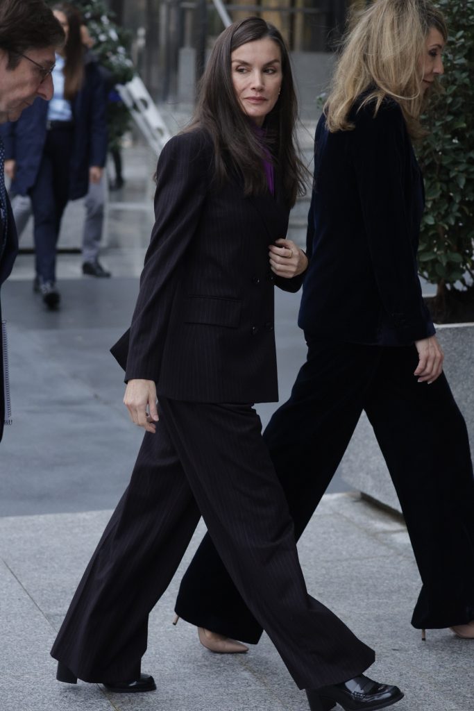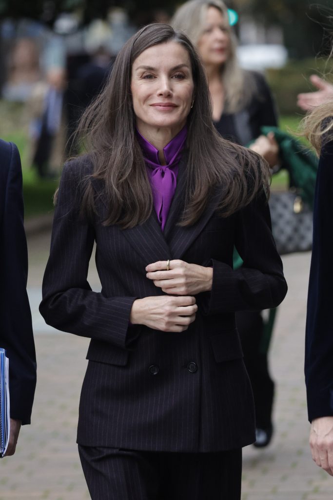 El traje, en tono gris oscuro con raya diplomática, encaja en la tendencia del power dressing que la Reina ha abrazado en los últimos años, una estética que transmite autoridad, sobriedad y profesionalidad. La elección del gris —uno de los colores más asociados a la elegancia institucional— subraya su intención de situar el foco en el contenido del acto sin renunciar a un estilismo cuidado.