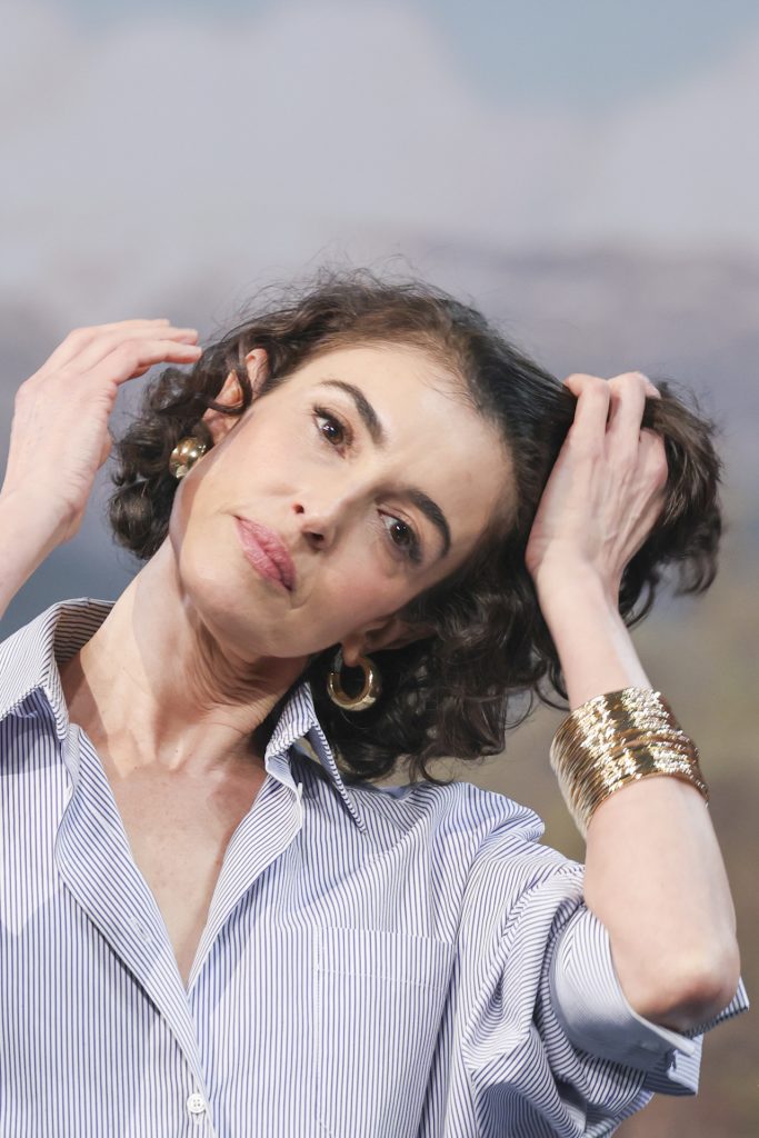 La actriz completó el conjunto con un brazalete dorado de gran tamaño y unos pendientes grandes de aro, también en dorado, los dos de Yliana Yepez, que aportaban un toque de brillo sin romper la armonía general. Su melena rizada corta y un maquillaje muy natural terminaron de construir una imagen fresca, luminosa y tremendamente personal.