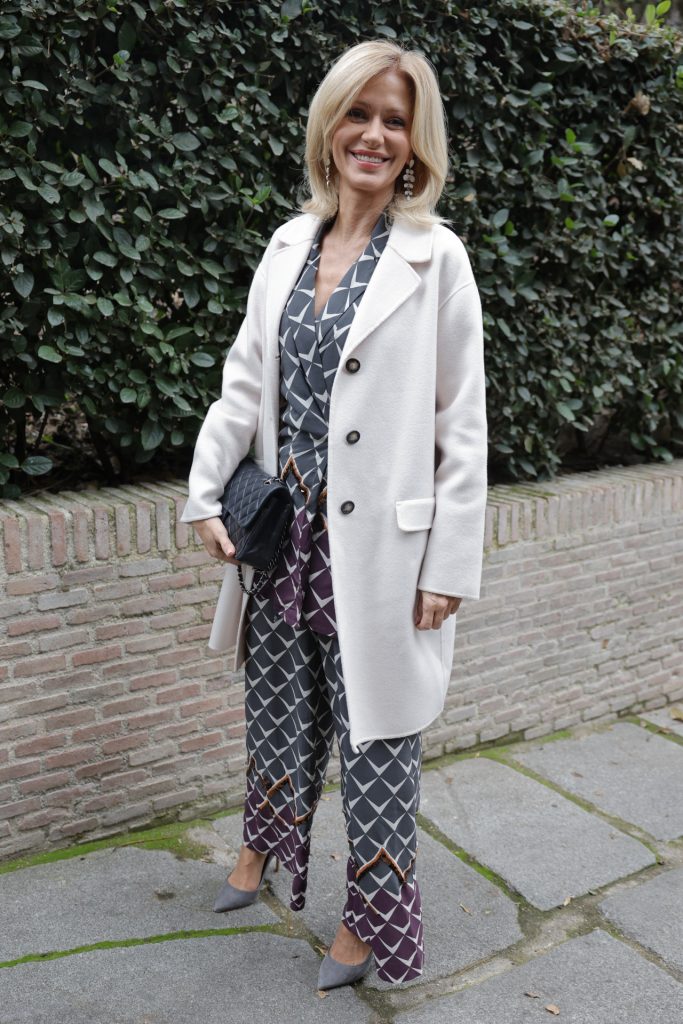 Susanna Griso completó el look con un abrigo recto en tono crudo, una prenda de líneas limpias y depuradas que aportaba equilibrio al conjunto geométrico que llevaba debajo. El diseño, de corte clásico y largo por encima de la rodilla, destacaba por su doble botonadura frontal con botones negros, un contraste elegante que reforzaba la sobriedad del estilismo. La presentadora lo llevó abierto, dejando que el traje fluido se convirtiera en el verdadero protagonista, mientras el abrigo actuaba como capa neutra y sofisticada.