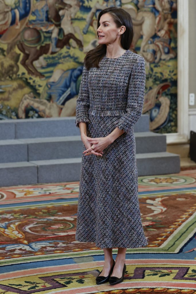 La reina Letizia retomó su agenda el pasado martes en el Palacio de la Zarzuela con una jornada de audiencias marcada por la moda, la salud y el compromiso institucional. La Reina apostó por un look impecable, profesional y con un guiño claro a la moda española: un vestido de tweed multicolor, una de las piezas más celebradas de su armario reciente para recibir a los representantes de la 83ª edición de la Mercedes‑Benz Fashion Week Madrid, a los de la Fundación para el Desarrollo de la Enfermería (FUDEN), y a al director gerente del Hospital Sant Joan de Déu y al presidente de FEDER.
