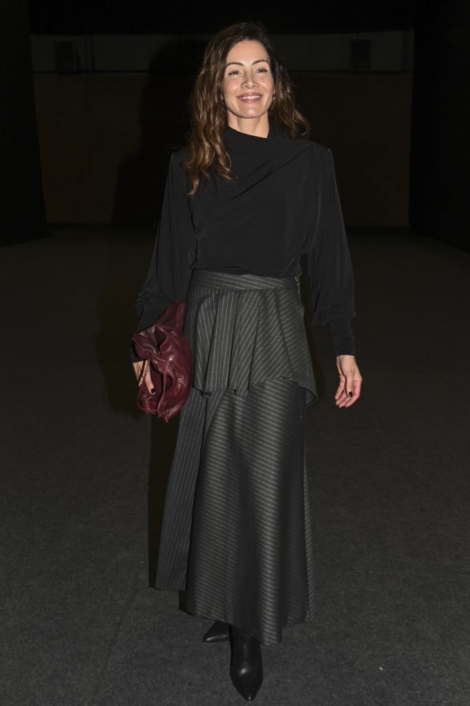Virginia Troconis apostó por un estilismo de noche impecable. Lució un top negro con drapeado y mangas abullonadas, una prenda con volumen que aportaba dramatismo y movimiento. Lo combinó con una falda midi de raya diplomática, estructurada y con un volante superior que reforzaba la asimetría del conjunto. El bolso burdeos introdujo un contraste elegante, mientras que los botines negros de tacón fino cerraron un look pulido, moderno y muy seguro de sí mismo.