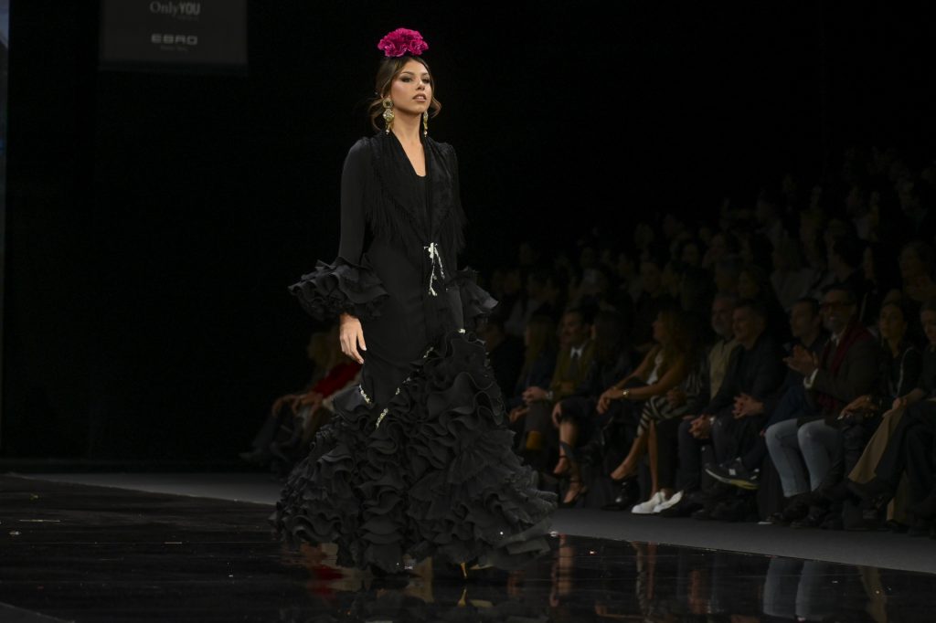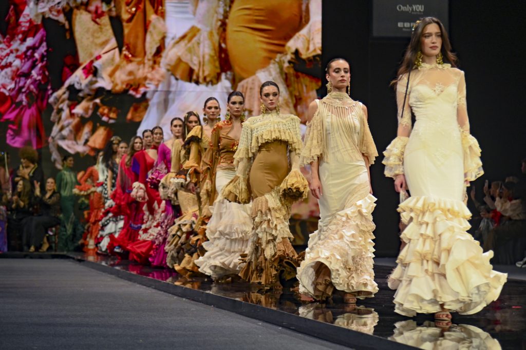 La propuesta fue un despliegue de encajes teñidos a mano, sedas naturales, espejos, dorados y lentejuelas, elementos que dialogaron con patrones renovados y tejidos pensados para aportar comodidad sin perder espectacularidad. El sello “agaviñado” —ese estilo bohemio, libre y exuberante que la caracteriza— estuvo presente en cada salida, con volantes en cascada, chorreras, flecos de seda y mantones reinterpretados que elevaron el estilismo a un nivel casi escénico.