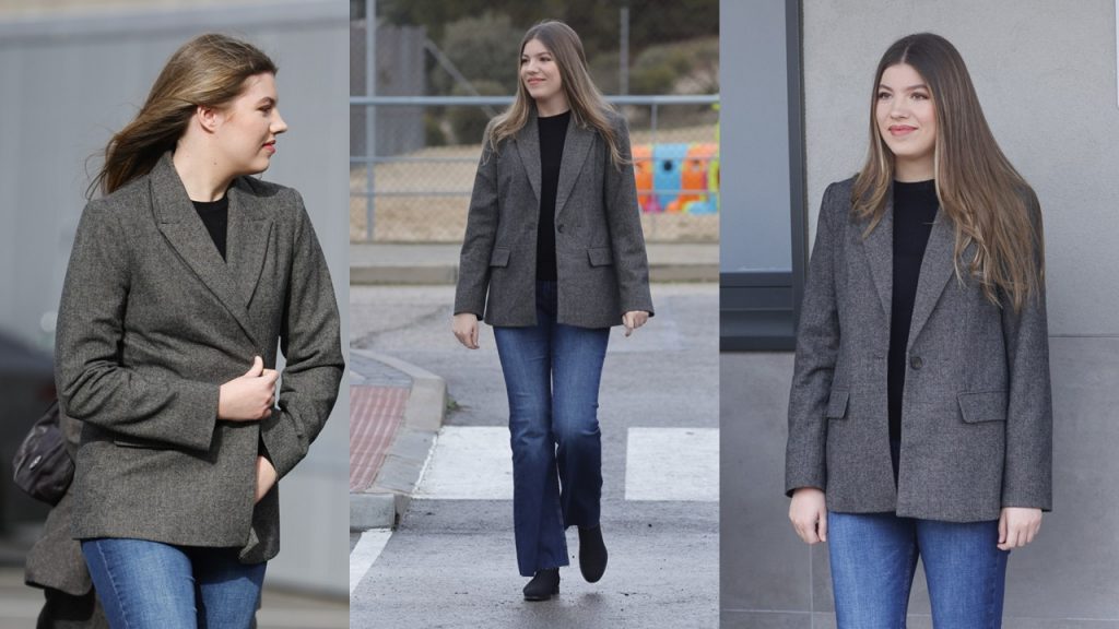 Para esta cita, Sofía eligió un conjunto que equilibra a la perfección la seriedad que exige un acto oficial con la naturalidad propia de sus 17 años. Apostó por una blazer gris de corte clásico, una prenda estructurada que aporta presencia sin rigidez. La americana, confeccionada en tejido de espiga y con cierre de un solo botón, pertenece a Zara y actualmente está rebajada, un detalle que conecta con el consumo real de su generación y con una imagen cercana y accesible.