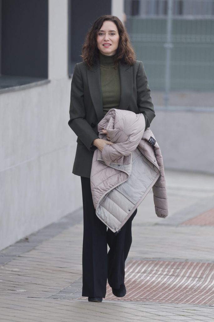 Ayuso eligió un abrigo acolchado en tono beige claro (se trataba del modelo Uma, de Ecoalf), una prenda práctica y cálida que encaja con un acto al aire libre y con desplazamientos entre diferentes zonas del complejo.