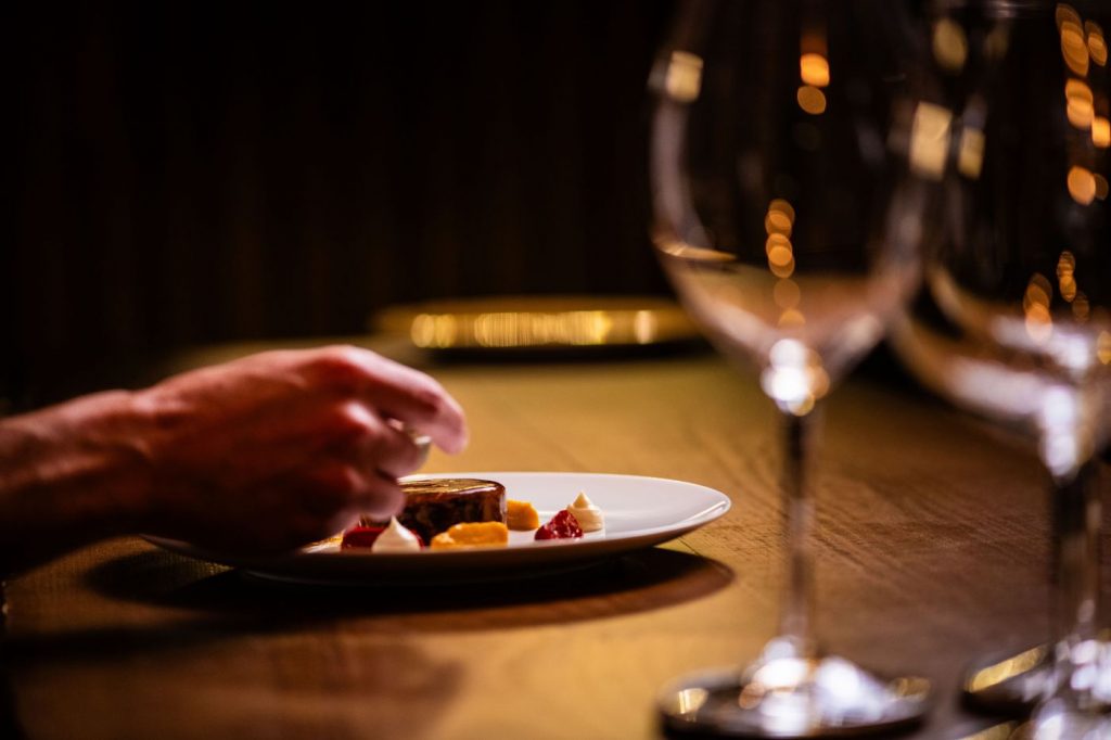 En este recorrido, la conexión con la tierra se intensifica. Perdiz en escabeche, texturas de judías y tartar de ciervo abren paso a un bloque central dedicado a la caza: gazpacho manchego de piezas de la finca, royal de jabalí y lomo de venado con foie gras y hongos. Un homenaje a la despensa cinegética del entorno, tratado con elegancia y equilibrio.