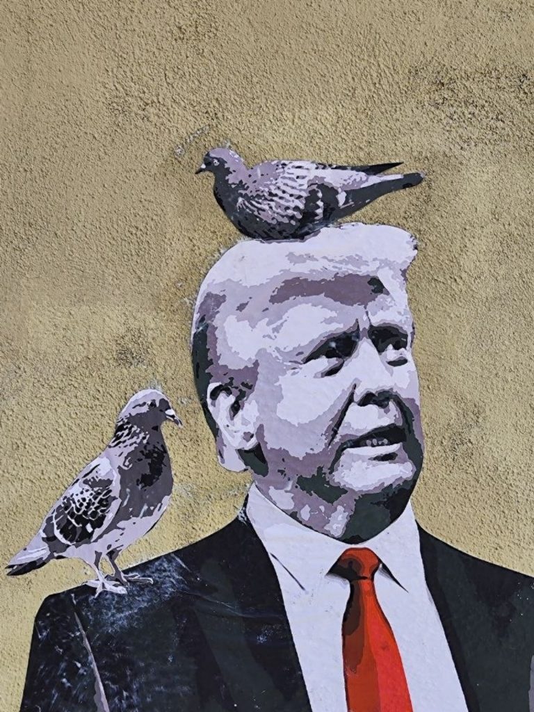 Frente a la luminosidad de Bad Bunny y el niño, Donald Trump aparece en un segundo plano, trajeado de negro, con gesto contrariado y las manos abiertas, como incapaz de comprender la escena. Dos palomas grises reposan sobre su cabeza y hombro, un detalle que el artista utiliza para simbolizar la pérdida y el contraste entre la paz y el rechazo migratorio.