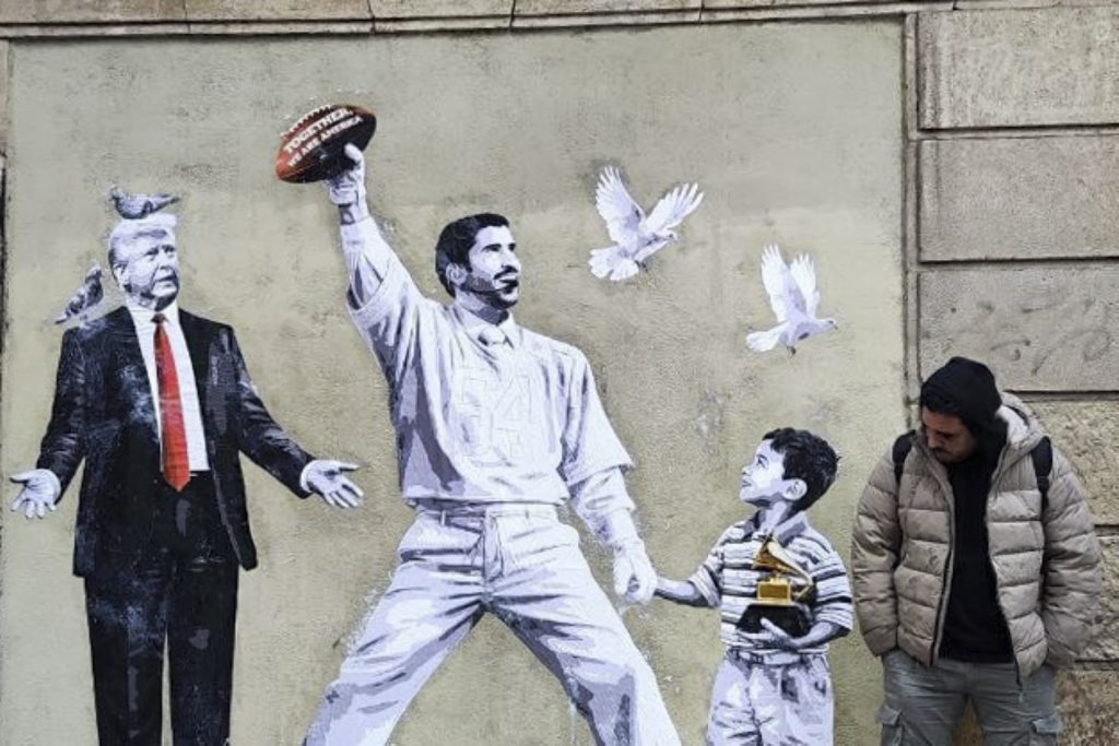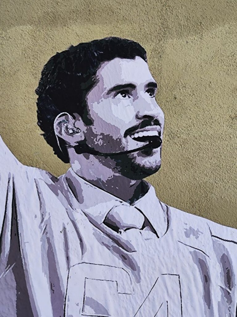 La obra se inspira directamente en la reciente actuación de Bad Bunny en la Super Bowl, donde el artista proyectó un mensaje de humanidad y esperanza. En el mural, aparece vestido de blanco, igual que iba en la Super Bowl —símbolo de pureza y paz— tomado de la mano de un niño que representa su versión infantil, un guiño a la escena del espectáculo en la que entregó un Grammy a un menor mientras le susurraba: “Cree siempre en ti”.