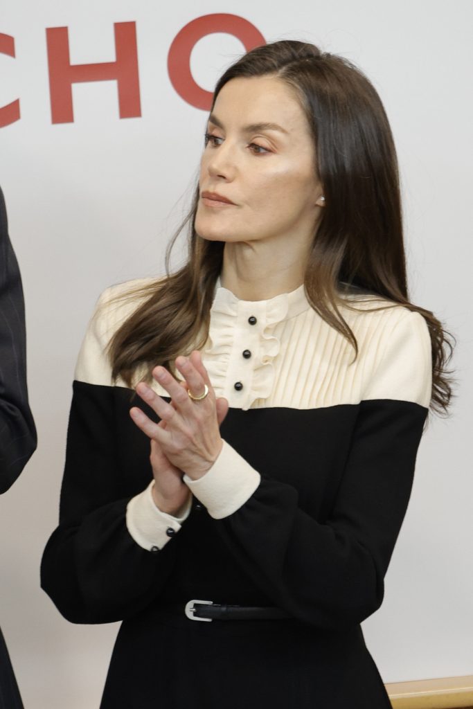Letizia completó el look con botas negras de tacón moderado, una elección práctica para un día de lluvia en Madrid y coherente con la estética sobria del conjunto, y su habitual bolso Victoria Insignia de Carolina Herrera, uno de sus favoritos en actos institucionales.