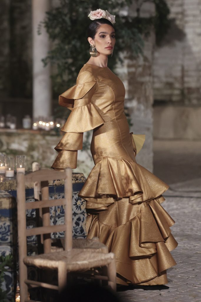La paleta cromática es intensa y vibrante: azules profundos, verdes, corales, amarillos y tejidos con acabados satinados y metalizados que elevan la propuesta hacia un imaginario festivo y actual. La colección combina materiales con cuerpo y flexibilidad, pensados para acompañar el movimiento natural de la mujer flamenca contemporánea.