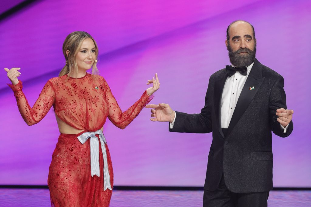 Cuando el reloj marcó las diez, Luis Tosar y Rigoberta Bandini aparecieron en escena para inaugurar una gala que combinó humor, música y un ritmo ágil. La pareja funcionó con naturalidad: él, sólido y cercano; ella, irónica, luminosa y con una presencia musical que impregnó toda la ceremonia. La gala avanzó entre actuaciones —Bad Gyal, Belén Aguilera, Dani Fernández, La Casa Azul, Ana Mena, Ángeles Toledano— y discursos que, sin perder la emoción, no esquivaron la actualidad internacional ni la reivindicación de la paz, un clásico en los Goya que este año resonó con especial fuerza.