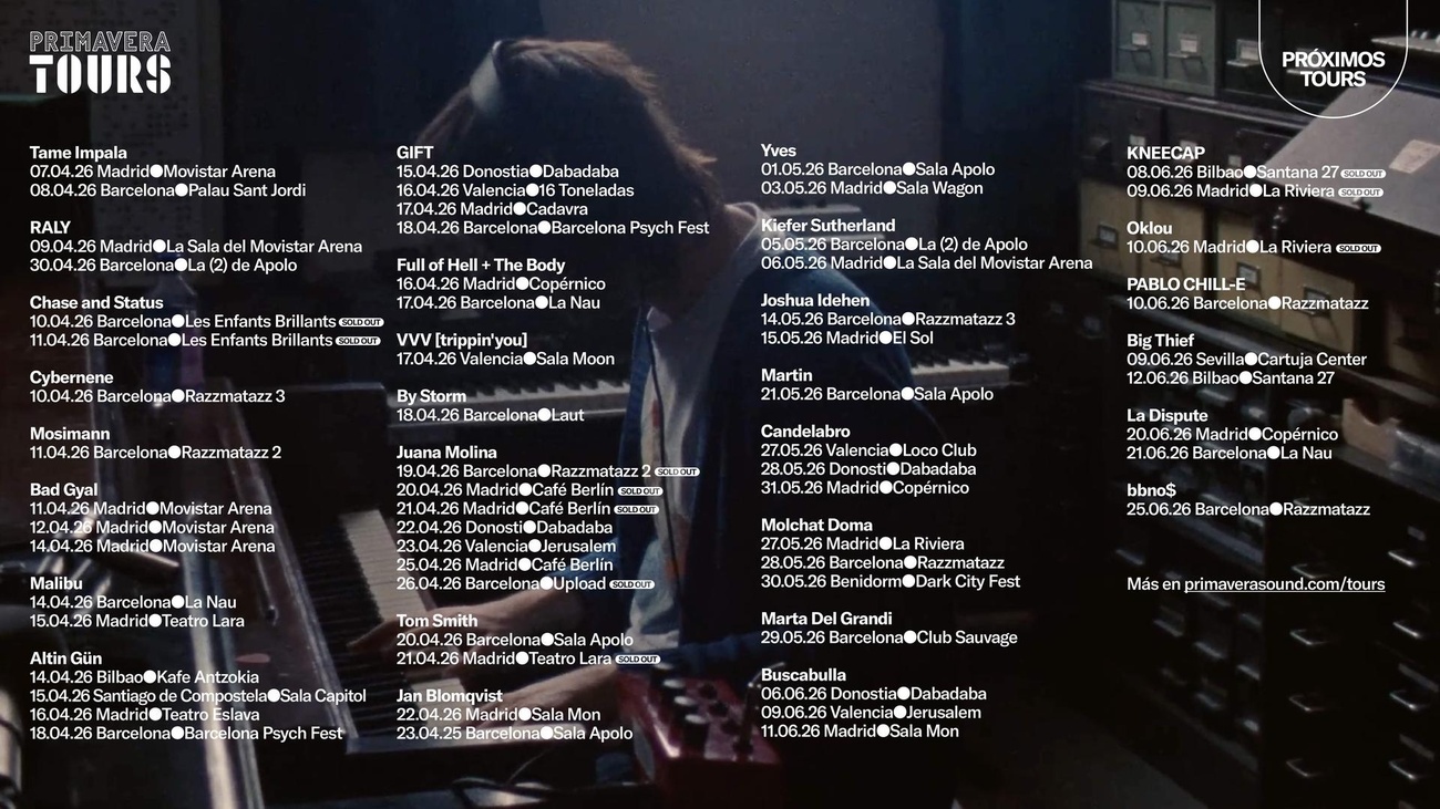 La gira primaveral comienza con dos citas destacadas: el regreso de Tame Impala a Madrid, ocho años después de su última visita, y su debut en formato de sala en Barcelona. Kevin Parker presenta en directo Deadbeat, su nuevo trabajo, en dos recintos de gran capacidad como el Movistar Arena y el Palau Sant Jordi.
